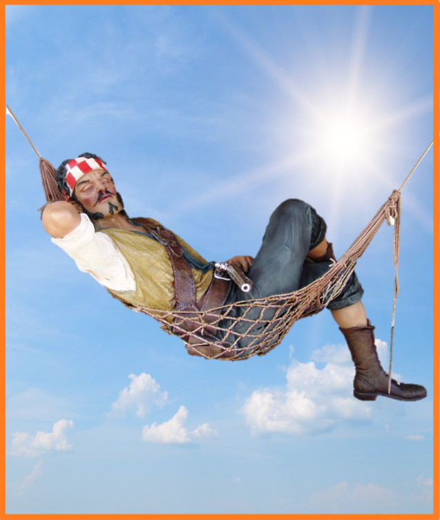 Livagtig sørøver liggende i hængekøje som kan hænges op mellem f.eks. 2 palmer
