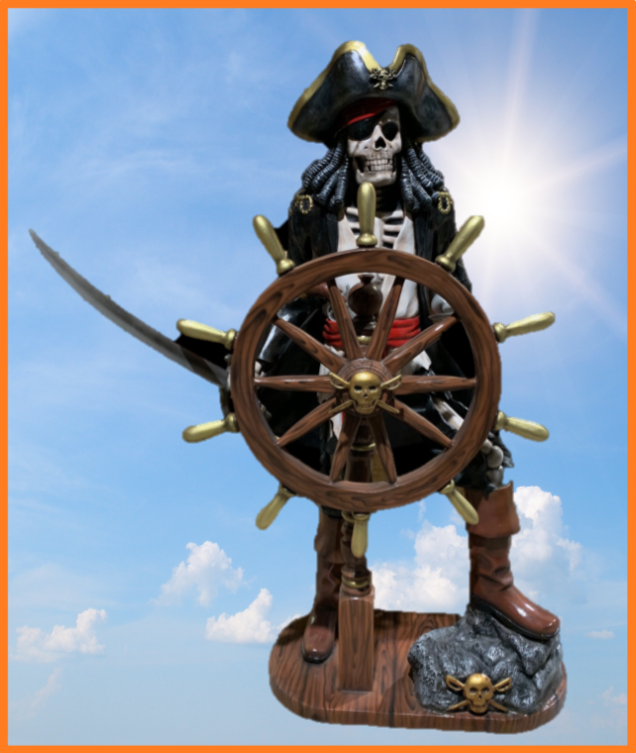 Stort og livagtigt sørøver skelet stående ved skibs rat med div. våben
