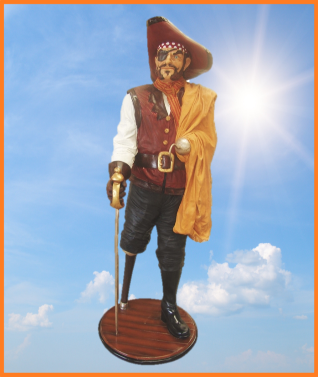Livagtig sørøver figur med træ ben, kårde og klap for det ene øje m.m.