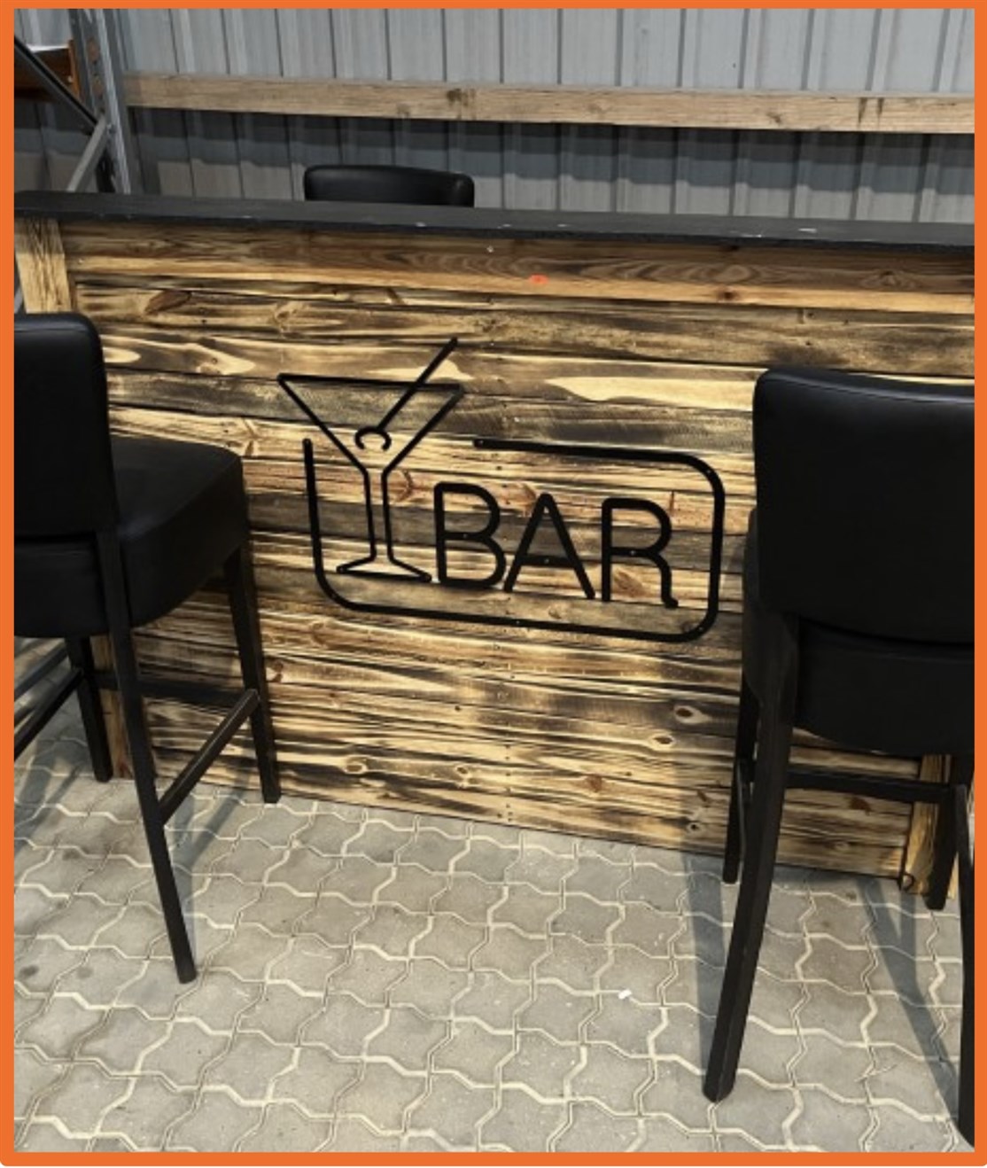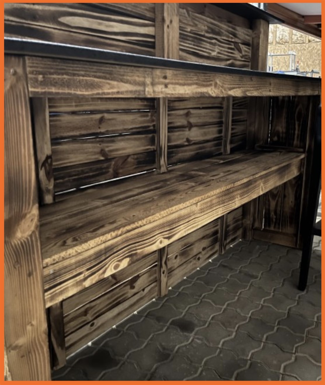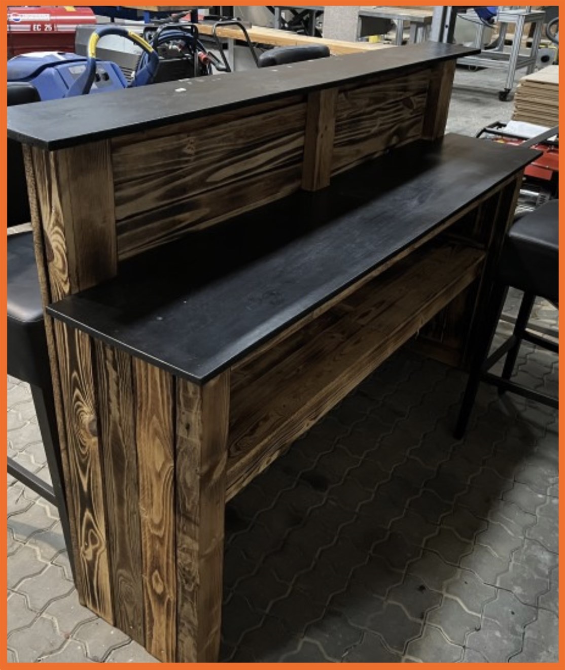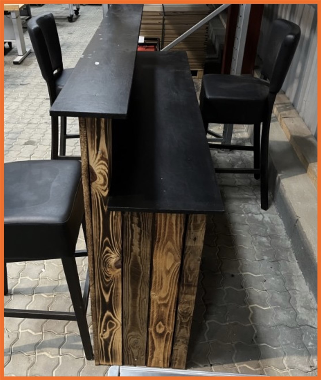 Her får du en bar flot bar i brændt træ med sorte bar plader og med mulighed og plads til montering af f.eks. fadølsanlæg med, samt med 3 stk. stabile barstole.